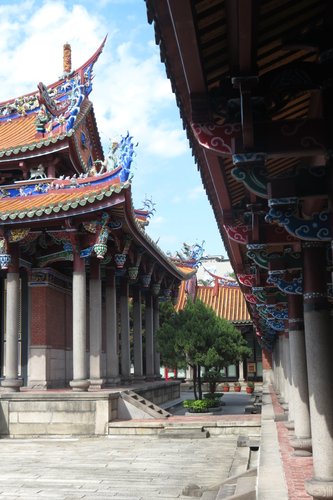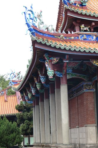 台北孔廟座落在寧靜的大龍峒,與保安宮相鄰,一個保佑蒼生眾庶,一個庇護天下學子,各司其職。孔廟的外觀與一般廟宇近似,但少了香煙裊繞,卻多了一層莊嚴肅穆的氛圍,要見其熱鬧氣氛,可能唯有每年 九月廿八日 的孔子誕辰那天吧!