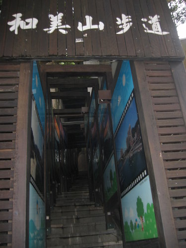 走過碧潭吊橋,橋下碧綠的新店溪佈滿了各式各樣的小艇,水鴨子,交通甚是繁忙,可是能好不容易雨停了,大家都跑出來透透氣。行至吊橋對岸端,就在攤販旁豎了一個和美山步道的導覽地圖。步道入口是一個很特殊的長廊造型,兩旁牆壁貼滿了碧潭景區照片,令人覺得區公所蠻有用心。