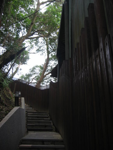 走了一小段到了一個小平台,看到指標,註明步道分為綠色親山步及藍色水岸步道。與妻先走綠色步道,回程看情況再走藍色步道。沿途步道整建得很整潔,唯一令人頭皮發麻的是,沿路的欄杆佈滿了毛毛蟲。在我們前面有一對母女也在健行。那位母親向我們解釋,這個時節會有很多毛毛蟲,大約到隔年元月時會蛻變成為蝴蝶。我登時恍然大悟,原來沿途有許多相關蝴蝶的說明圖。那對熱心的母女一路為我們解說步道的特色及典故,方知這裡以前有個遊樂園,挺熱鬧的,只是現僅見其雜草相伴的廢墟。