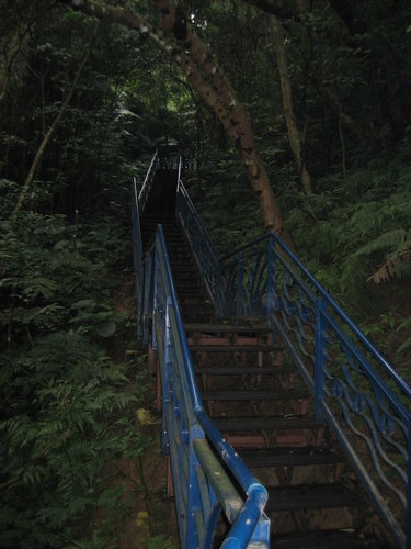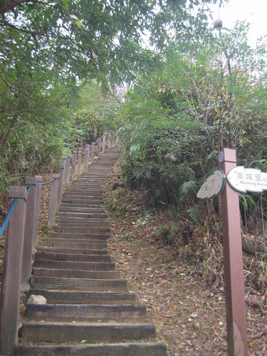 到和美山頂點前有一小段陡坡,無須秏費多大力氣即可攻頂。抵頂點平台處,果然美景盡入眼簾,更可遠望101大樓及南港山,假如天氣再晴朗些,視線想必更佳。回頭往藍水岸色步道方向走,到另一個叉路,有個指標指向林棧步道,再對照一下原先準備好的地圖,發現該步道可到達渡船口,於是決定走林棧步道,途中有個景點可以眺望整個碧潭美景,視野很好。