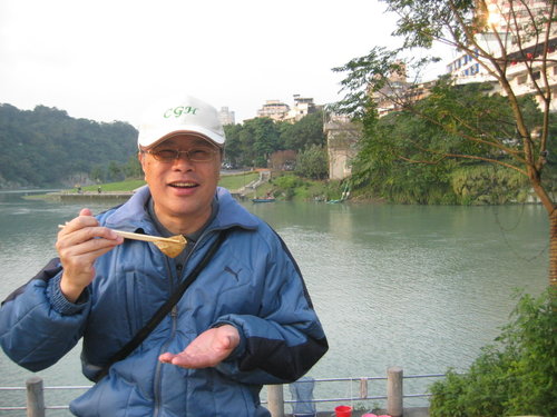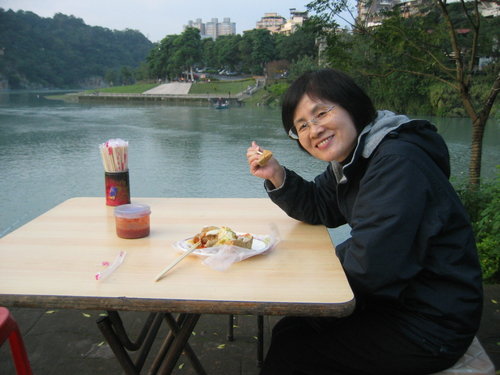 到了步道盡頭,順著柏油路並依指標走,不一會兒即到了新店渡船頭。與妻買了一份臭豆腐,就在岸邊享受美食兼賞美景,甚是愜意。
