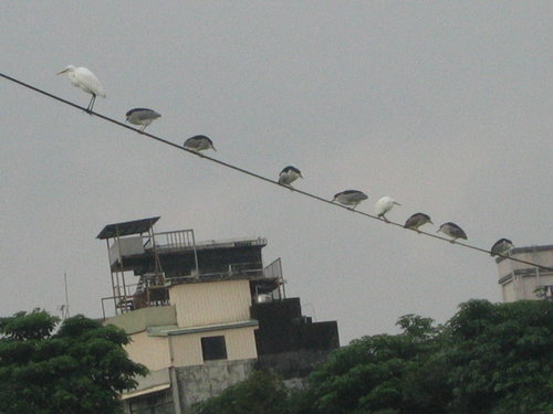 或許是假日之故吧,也或許是許多人想回憶一下坐渡船的往事吧,只見擺渡老伯不停來回載客;同時偶見三三兩兩的白鷺鷥翱翔於溪上,或棲於電纜上,或歇於河畔,好一幅恬靜幽美的景色。