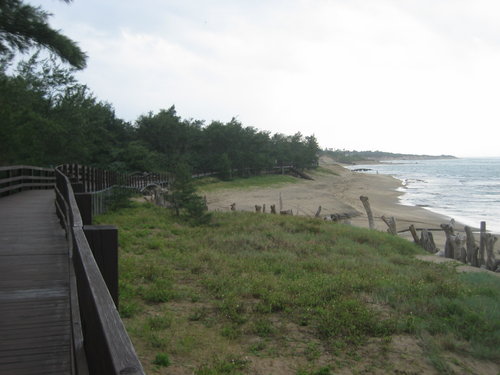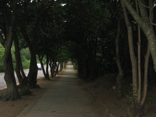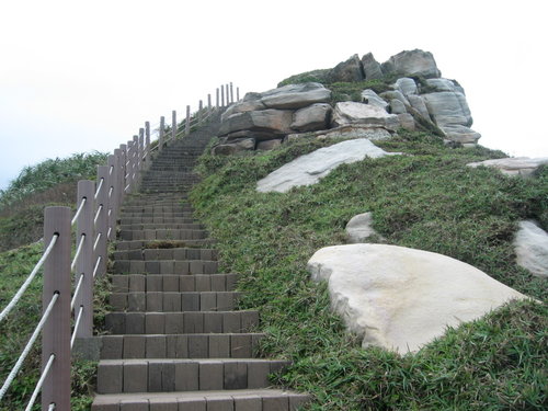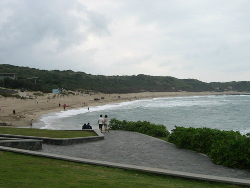 到了白沙灣入口處,找到往麟山鼻的步道,因為是人車分道,走起來毫無壓迫感。約莫十來分鐘,走到了木棧步道,根據資料,這裡是「不能說的秘密」拍攝場景之一,怎沒看到周杰倫與桂綸美?木棧步道很長,走起來很舒服,且緊隣著沙灘,可以很悠閒地欣賞海景,可惜當天沒有陽光,否則就觀賞夕陽了。沙灘上,好幾個女生每個手拿一台相機(單眼或類單眼?)拼命拍照。由此看來,近來電視上頻頻出現的以女生為行銷對象的相機廣告,是一支很成功的廣告。