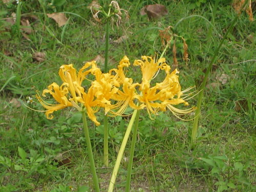 順著步道前進,到了一個陡坡往下走可到礁岩海岸,可更近觀賞雙燭臺嶼。回到八角亭涼亭附近,看到旁邊一小蕞黃花—金花石蒜,戶乍看之下會誤以為是金針花,還好事前有作功課,知道那是獅頭山公園特有的植物。