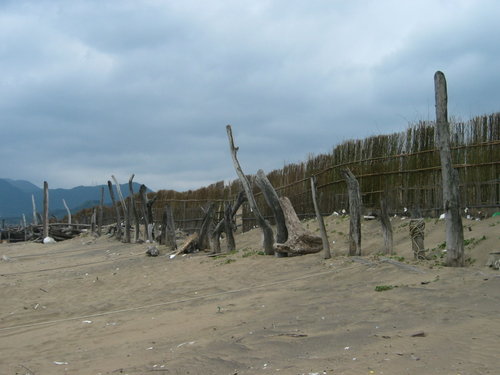 接著依指標走水尾步道,約五、 六百公尺 後抵水尾漁港附近,經過一座觀景橋,到了所謂「舊金山海灘」。沙灘築起一排竹籬笆防風林。許多漂流枯木被一一豎起充當防風的第一線勇士。