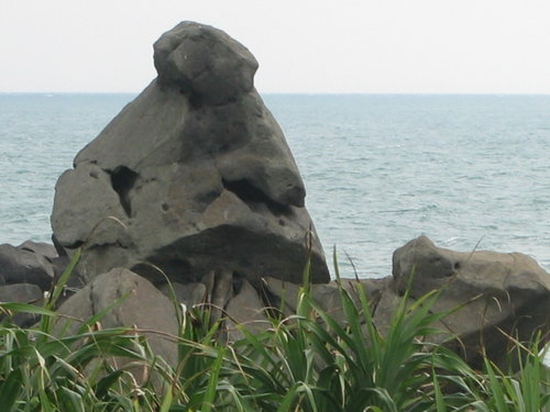 用完餐,剛好趕上一班往淡水的客運。接著抵第二站:富貴角。沿途行人稀少,快到燈塔處,感覺海風比上午的強,且天色亦較昏暗,有山雨欲來之象。此處的岩石很奇特,呈灰黑狀,原來名稱「風稜石」,是富貴角附近最具特色的海岸地形。