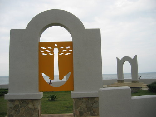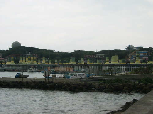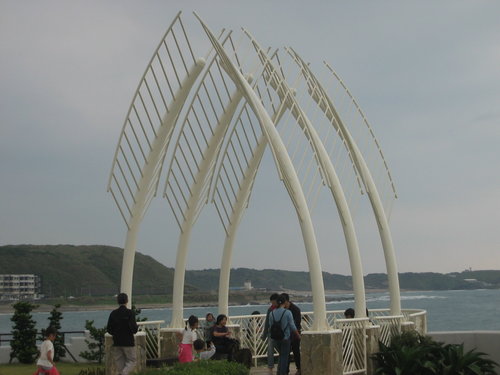 富基漁港的大樓頂豎立一連串好像煙囪般的建物,挺有趣的,不知是有用途的,還是純為造景目的。走著走著,到了石門緍紗廣場,緊臨著海邊,設計了很多式樣的造形,提供給新人拍緍紗用,當然也給遊客多了一個休憩的場所。