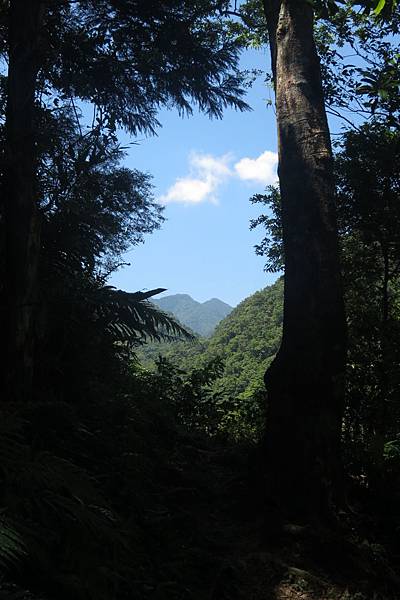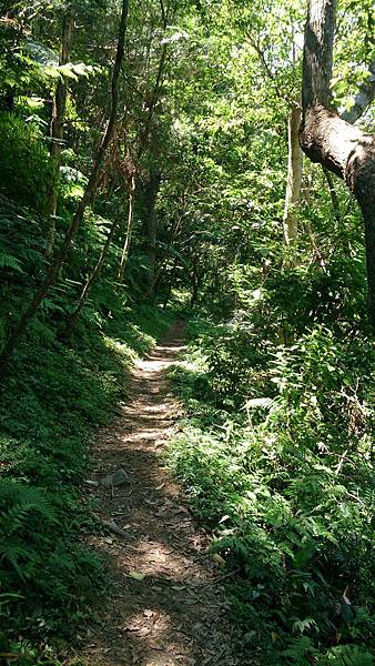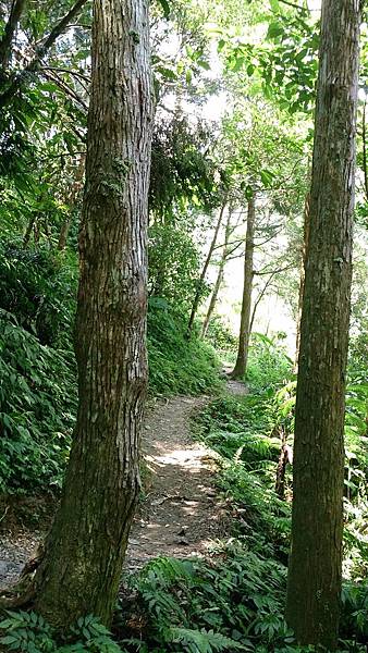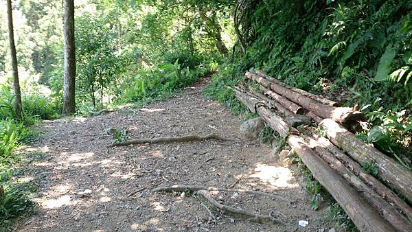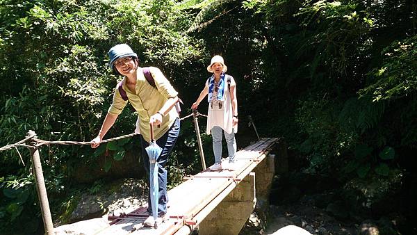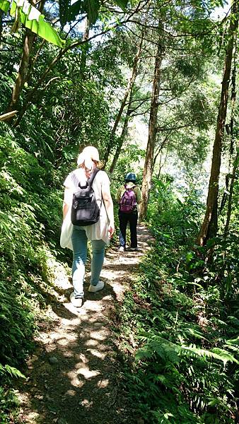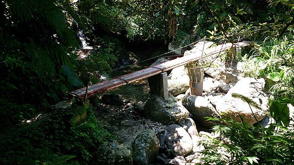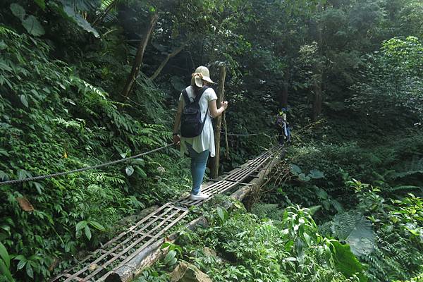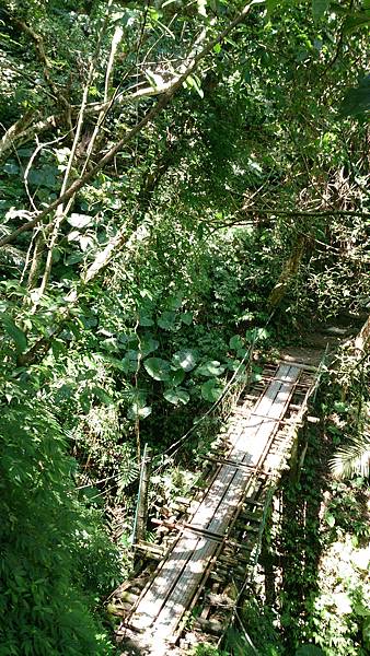 接著續往前行,經過第一座由簡易鐵架作成的獨木橋,還好溪谷不深,橋距不長,但已令懼怕走吊橋的老婆舉步維艱。後來又經過兩座類似的獨木橋,此行對老婆真是一大考驗!由於步道係循著山腰蜿蜒而行,許多路段狹窄且緊臨懸崖,靠山谷端雖有林木雜草相錯,遮掩了峭壁深淵的恐怖感,但對於幾乎少走山路的女兒而言,已夠她心驚膽顫的了,一路上直呼害怕。因此依時程本應已到達工寮卻仍不見目的地,研判離目的地工寮大概只剩十來分鐘路程時,為了家人安全起見,最終還是決定放棄,原路折回。