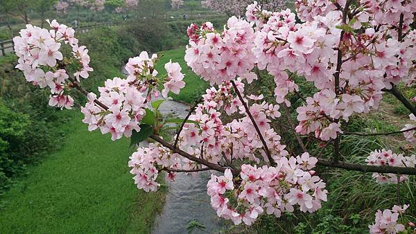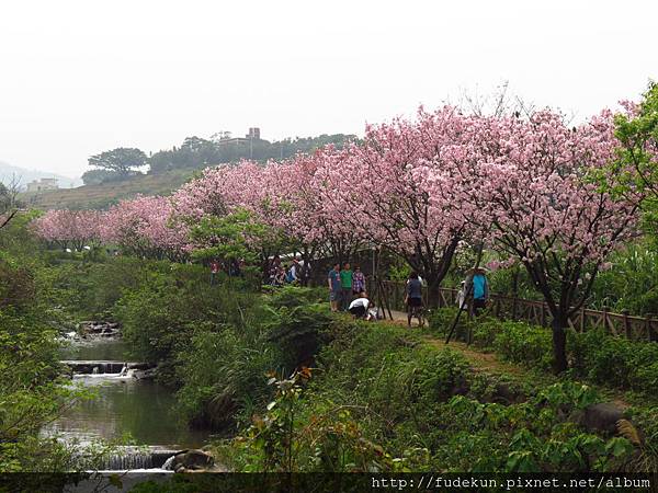 下車後往右邊道路前進,一路上就看到零星的粉紅色櫻花列隊兩旁迎賓,彷彿最佳指標。約莫百來公尺即達三生步道,盛開的粉紅色櫻花令人目不暇給。成排粉紅色櫻花沿著溪畔滿開,紅綠相間,讓人流連忘返。