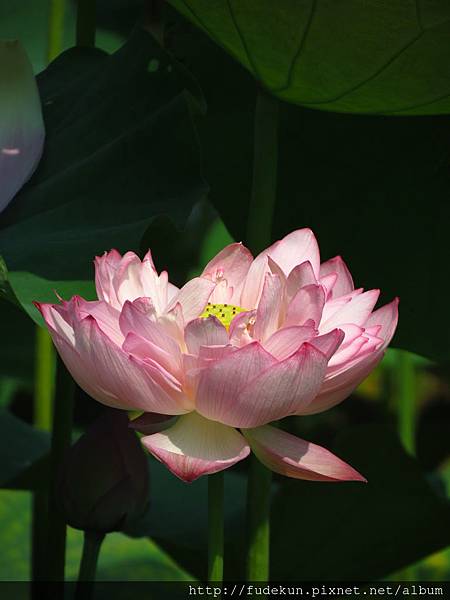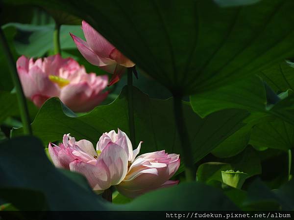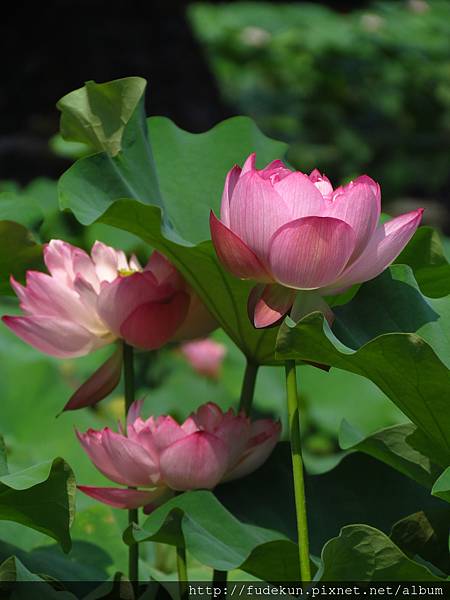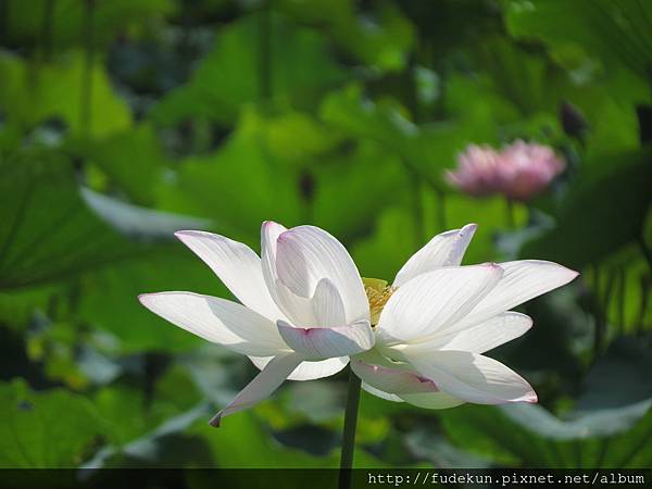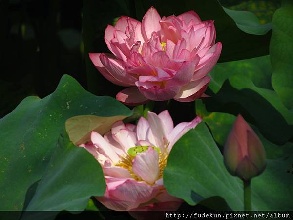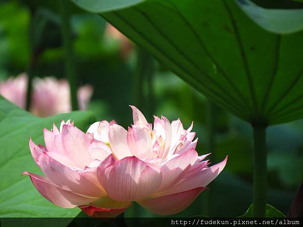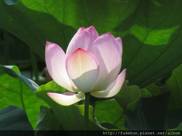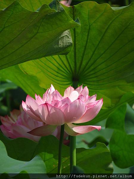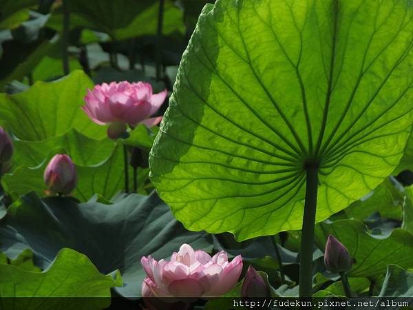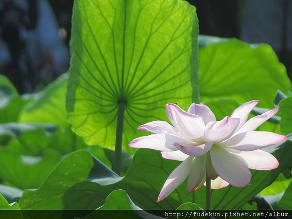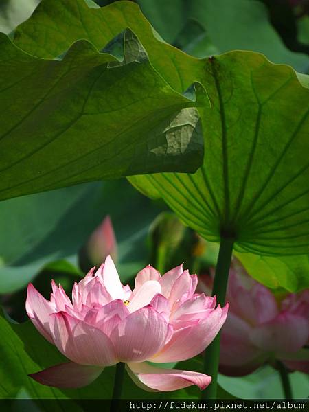 烈陽照射,荷葉更顯鮮綠,葉紋清晰可辨,花瓣吹彈可破。