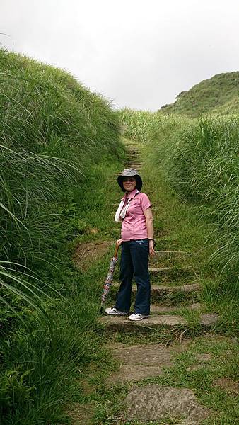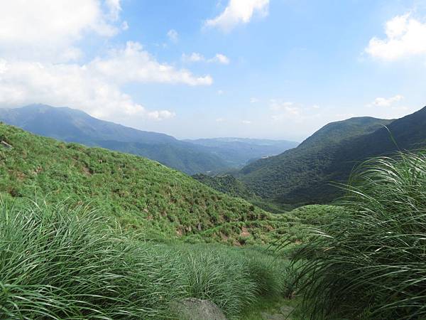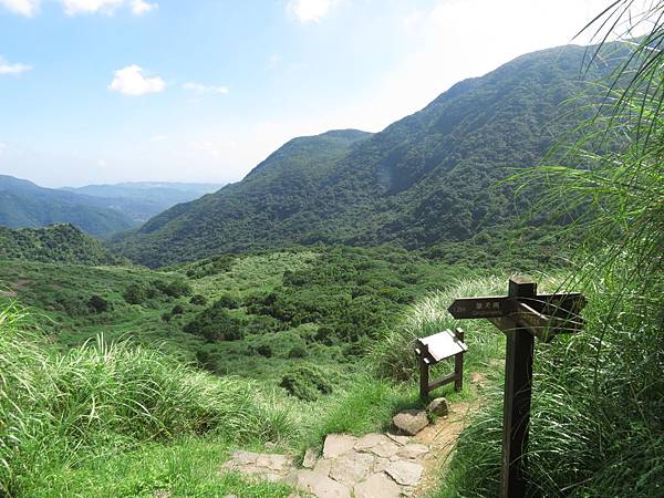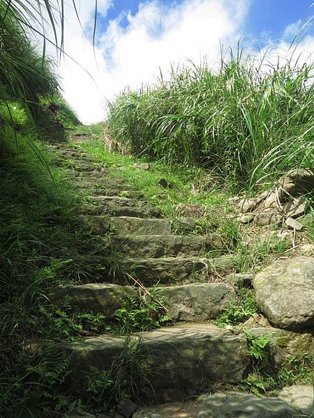 行至大石公處,是昔時金山和草山的分界點,景觀也大為改變,由此而上,放眼仰望,滿山全為芒草所覆蓋,且因亳無遮蔽之處,陽光直射,溫度頓時上升不少,熱感隨即上身。