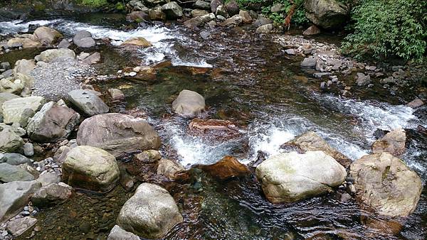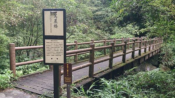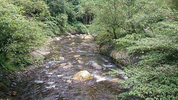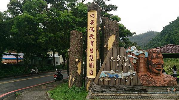 九寮溪步道入口位在大同檢查哨站中油加油站旁,而下車處也正好在加油站前,甚是方便。入口處立有明顯的地標,想錯過也難。不過還得走約10分鐘左右,經過大停車場後才是真正的步道入口。前半個小時左右的步道幾乎都是走在產業道路上,沿途沒什麼迷人景色,雖有淙淙流水聲相伴,但步道並非一路沿著溪邊而行,也毫無遮蔭之處,走來有得乏味。直至步道逐漸縮小並轉換為碎石子路時,景觀也為之多樣,有棧道,有拱橋、吊橋,還有濃密綠蔭,愈接近九寮溪上游,溪水愈顯湍急強勁,隨著溪谷愈趨狹窄高峭,巨大的水流衝擊拍打溪石的聲勢也愈加雄壯浩大。