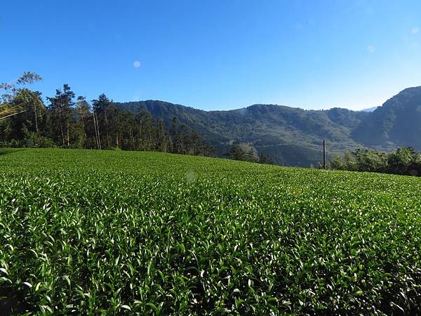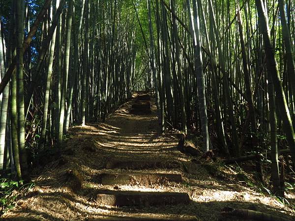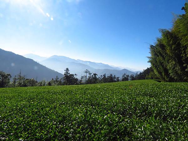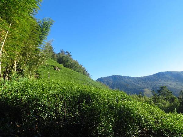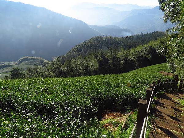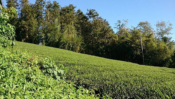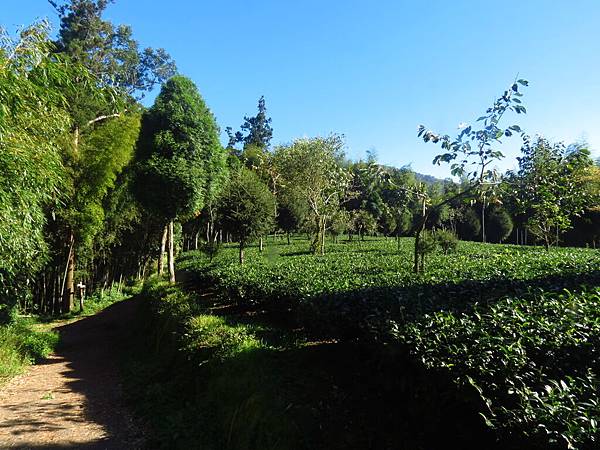 霧之道終點越過產業道路即為茶之道入口,茶之道的前段幾乎都是茂密的竹林。陽光透過竹林間隙灑進步道內,呈現明暗層次明顯的景致。然而走了大半段卻未見任何茶園景色,心想可能被竹林給隔開了。直至一處空曠處,才看到翠綠的茶園滿佈在緩緩山坡上,稍解心中疑惑。不一會兒,步道又轉進杉林內,茶園又離開了視線直到茶之道終點才又看到令人殷盼的景色。