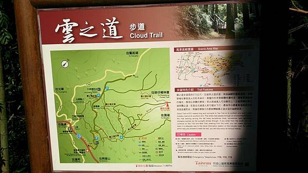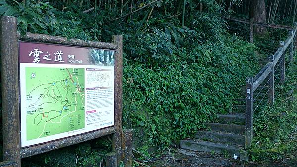 茶之道終點可以看到一面清晰的雲之道步道地圖,即為雲之道入口,雲之道幾乎都是高聳筆挺的杉林。一路下坡途中遇到一對夫婦,彼此寒暄閒聊了一會兒,得知他們是住在雲之道下方入口處附近的民宿,也是來健走附近步道。彼此交換了民宿的資訊作為他日可能再訪此地時住宿之參考,互道幸會後各自往目的地繼續前進。